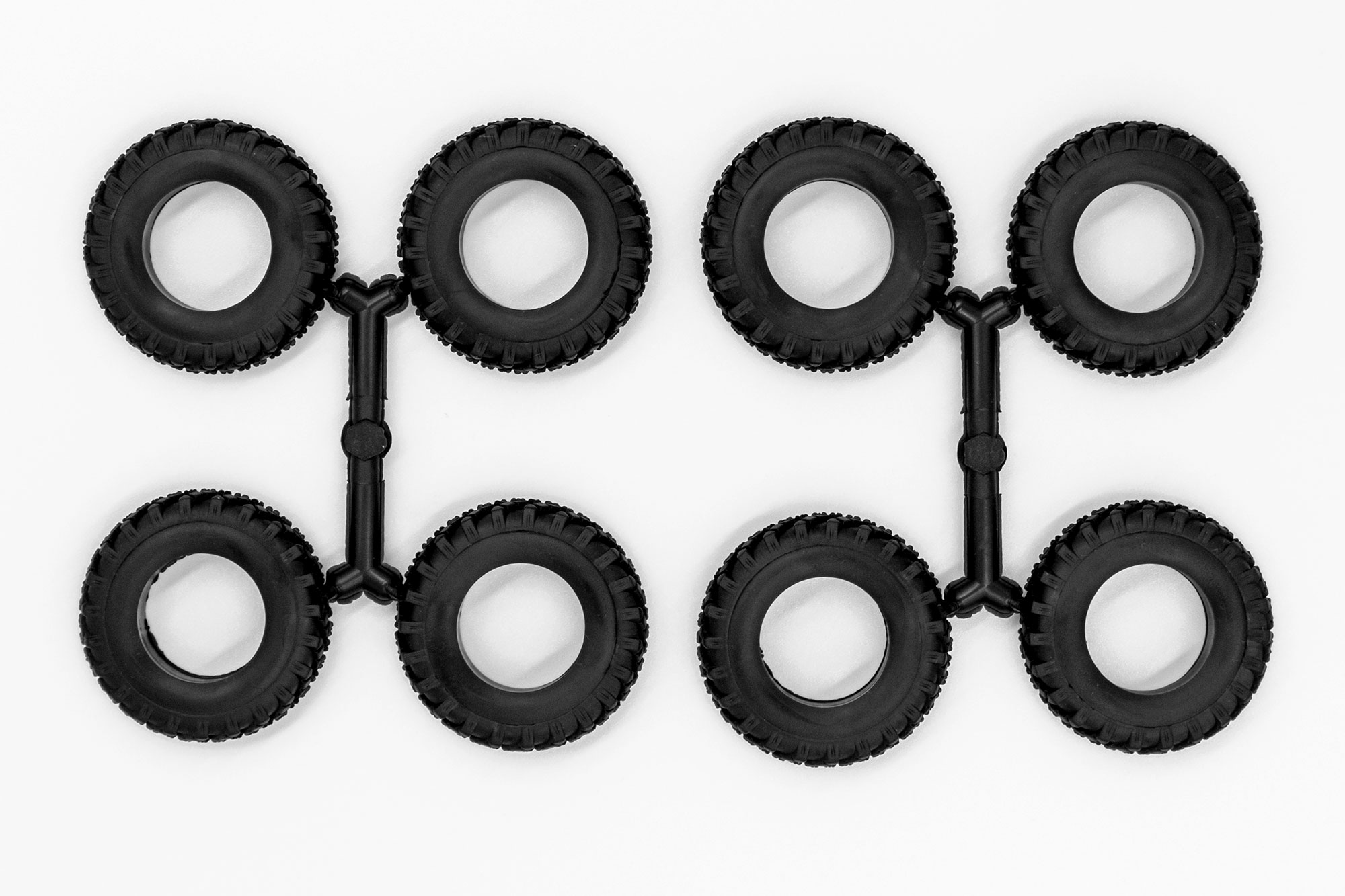 Покрышки из резиноподобного пластика с проработанным рисунком протектора.